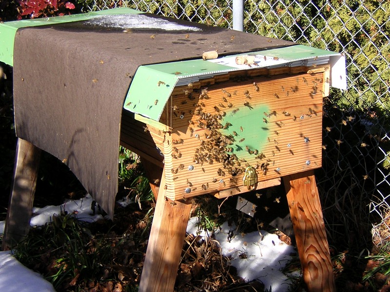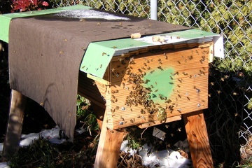 In the photo you can see that they're fine. Two days ago, on the first warmish sunny day, there were a few dozen bees flying around and pooping in the snow, and yesterday they all came out. You can also see that they like the front entrances better than the top entrances that the hive was designed for. I've drilled a total of five holes on the front, and through most of winter I had three of them sealed with wine corks. On the coldest nights I closed them down to one hole -- you never want to completely close it because they need ventilation to get the moisture out. That black thing is tar paper to help them keep warm, but I've removed it now, and as the weather warms I'll keep more entrances open full time. They still have massive honey stores, and should regrow their population with no supplemental feeding and be ready for the first flowers in a month.