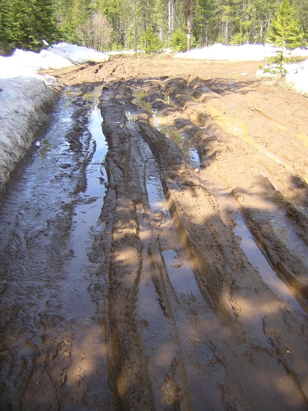 Epic -- 14 April 08 -- "Epic" is a rock climbing term for a climb that has unforeseen complications and takes much longer than expected. This is the road on the way in, which I did expect, so I had parked the car back at the edge of the pavement and set out on foot over two miles of dirt roads. At this point I was still barefoot, but a bit later the road passed through a shady area and was covered with ice, so I had to put boots on.
