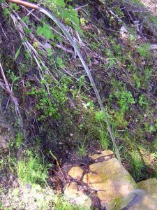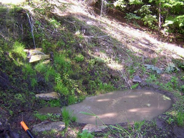 This photo shows how much water comes out in siphon mode, and you can click here for a big photo that shows the water flowing into the lower pool. Last year when I did this, a lot of water overflowed the lower pool and ran down the trail. I'd like to get the overflow into a third pool, and I thought about turning the trail into a stream and building a bridge over it, but that's a huge job, and I decided instead to build some kind of tiny streambed that would take the water over the trail at the top. And when I saw how slow the pipe was running, I decided to do it on this trip.
