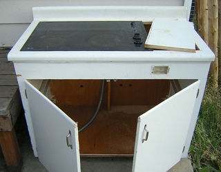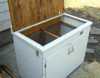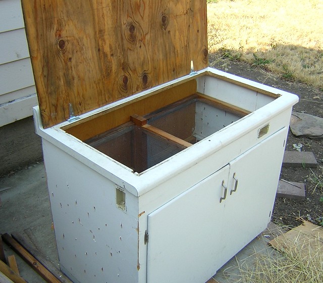 Houseblog: Compost Cabinet - 12 December 2011 - This is a project I did mostly in September and only now got around to making a post. In the first photo you can see the stove cabinet that I hauled out of the kitchen. Previous owners moved the oven to another place and made this thing to hold up the stovetop. It was shrinking the kitchen too much, so I removed it to replace it with something else that I'm still working on. But it occurred to me that this would make a good enclosure for compost. So I removed the stovetop, cut the rest of the top off, and then set them temporarily back on top for the photo.