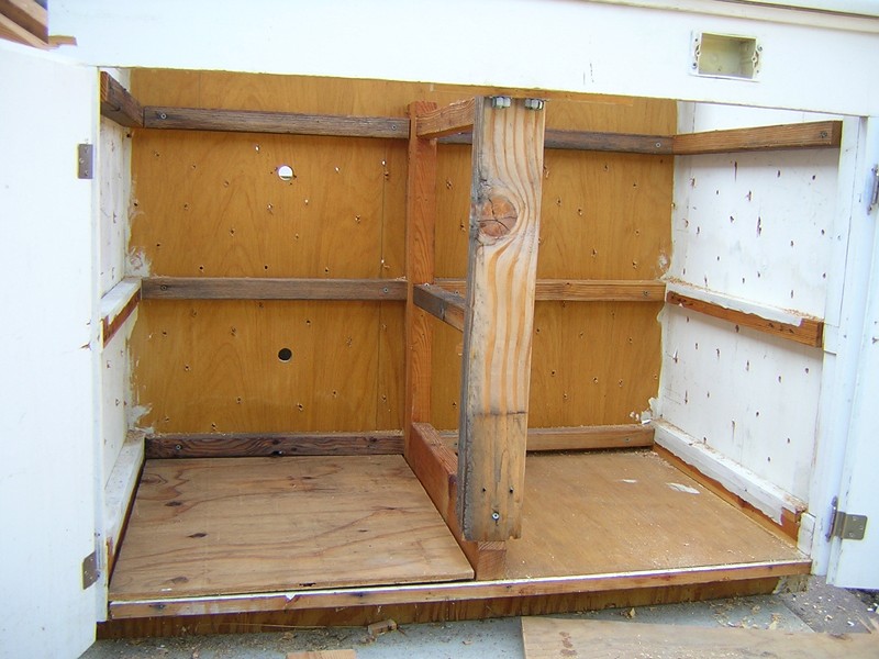 This is the new oven, all installed. You can see that I had to cut away some of the frame to get it in there. Also I had to do some work under it. The old oven was resting on two 2x4's, on a thin piece of plywood, which was unsupported at one corner! Ten inches below this was a shelf made of a thicker piece of plywood. I removed the 2x4's to create enough vertical room for the larger oven, switched the two pieces of plywood so the stronger one supported the oven, did some sawing to make both shelves fit, and nailed in some scrap wood to support them better.