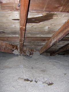 Houseblog: Roof Leak -- 6 September 2011 -- Last week we had the first big rainstorm since I took possession of the house. So I poked my head in the attic to see if there were any leaks in the roof, and saw this. You can see there's a wet spot on the underside of the roof, and there was a slow drip down to another wet spot in the insulation. (It's cellulose, not asbestos.) I put a pan under it and the next day I climbed on the roof. When I couldn't find any obvious holes, I climbed back down, went back in the house, climbed back to the attic, and used my hands and arms to carefully measure the location of the leak, using a roof vent as reference. It might have been a span over and three cubits down.
