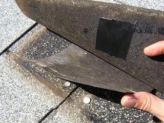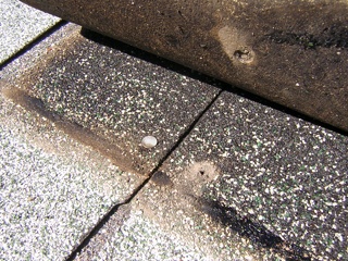dimple on one of the shingles. Underneath I found this. Apparently one of the nails worked itself loose and fell out, and on the way it made a tiny hole in the shingle above it, conveniently matching the hole below.
