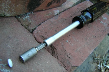 And here's how I fixed it. In a pile of house scraps, I found another roofing nail that had a rubber washer under the head, and pounded it in the hole. Then I duct taped the bottom of the shingle, and just to be extra safe, I stuck in a piece of tar paper.