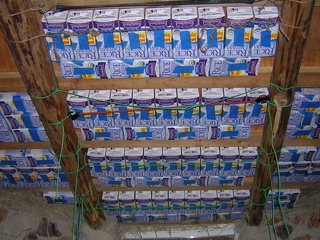 Landblog: Hut Roof Insulation -- 19 September 2011 -- I've done almost nothing on the land this year except this one little project, which was mostly done by Troy. The idea was to insulate the underside of the hut roof with a bunch of empty rice milk cartons. So, how do you attach cartons to the bottom of a piece of plywood? The normal way would be a bunch of toxic goop, but I wanted to do it with thumbtacks. This turned out to be difficult. Thumbtacks are made for cork board, not plywood. You need to drive the tack hard and straight. How can you do that from the inside of a carton?