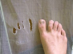 Seriously, you're all welcome to visit. I should be up there for most of late July and August. I've got some quinoa and red wheat, and otherwise you have to bring your own food. And you don't really have to do any work. Email me for more details at (my name as one word) at gmail. And here's a photo of where the bear mauled the bug screen on the outhouse, with my foot for size comparison. See, it's pretty small (for a BEAR).