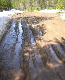 Epic -- 14 April 08 -- "Epic" is a rock climbing term for a climb that has unforeseen complications and takes much longer than expected. This is the road on the way in, which I did expect, so I had parked the car back at the edge of the pavement and set out on foot over two miles of dirt roads. At this point I was still barefoot, but a bit later the road passed through a shady area and was covered with ice, so I had to put boots on.