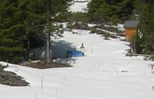 When I came in sight of the land, the snow was gone off the north hill but still deep in the low areas. Here's a detail from the photo I took. The outhouse is looking good, the tarp is still covering my wood, but to the left of that is the dead fridge I use for storage -- on its side! Apparently it was knocked over by a bear, maybe months ago.