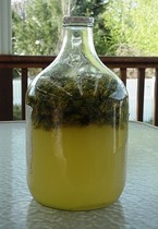 [Update August 2006. After a couple months I took the dandelions out. It tastes great! Strangely, it's not nearly as fizzy as the plain mead.]