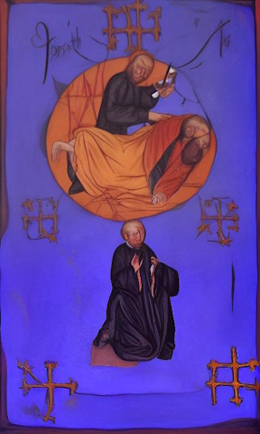 But Easy Diffusion has a feature where you can set an initial image and apply a prompt. So at some point I decided to try something random. I took a phrase I got earlier in the day from bibliomancy, "the death of the bishop" and used that as the prompt, and impulsively picked an image from my colorscapes folder, Carving the Crescent. The result was the strange Medieval image that you see here. I liked it so much that I tried the same prompt with five more images, which took quite a long time, and the results were all lame. It's interesting that even in the supposedly deterministic realm of machine learning, there's still beginner's luck.