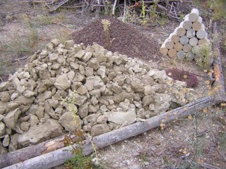 Pale Brown Gold -- 8 September 09 -- Here's some of the stuff I've hauled up in the last month: cylinders, lava rock, clay, and between the clay and cylinders, you can see the patch of wild oregano. Behind the stack of 21 cylinders you can barely see another stack of 21, and another eight have already been moved up the hill. The pile of lava rock is about half of the total -- the rest has already been used to fill water trenches, or has yet to be dug out of the back garden of the guy who's giving it away. And that's somewhere from 3000-3500 pounds of clay, hauled up from north of Sandpoint in five loads, one last Thursday, and two on Sunday and two on Monday over Labor Day weekend.
