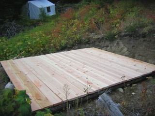 The Tent Platform -- 19 September 09 -- A few years ago Chris helped me dig a spot near the bottom of the north hill, where I was planning to build a cabin. Then this year I got a really nice canvas wall tent from davistent.com, and put it there temporarily. Then I decided that the spot was too dark in the winter, too small, and too unstable for the cabin, and that I'd keep the tent there permanently. Since then, almost every visitor has told me I should put it on a platform. It will help keep it dry, and apparently some people would rather sleep on a wooden floor than on the ground.