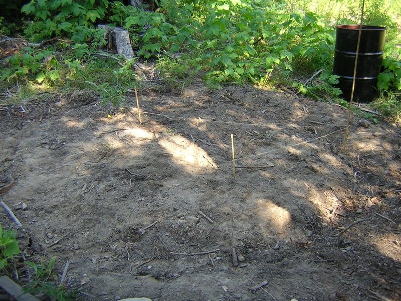The Tent Platform -- 19 September 09 -- A few years ago Chris helped me dig a spot near the bottom of the north hill, where I was planning to build a cabin. Then this year I got a really nice canvas wall tent from davistent.com, and put it there temporarily. Then I decided that the spot was too dark in the winter, too small, and too unstable for the cabin, and that I'd keep the tent there permanently. Since then, almost every visitor has told me I should put it on a platform. It will help keep it dry, and apparently some people would rather sleep on a wooden floor than on the ground.